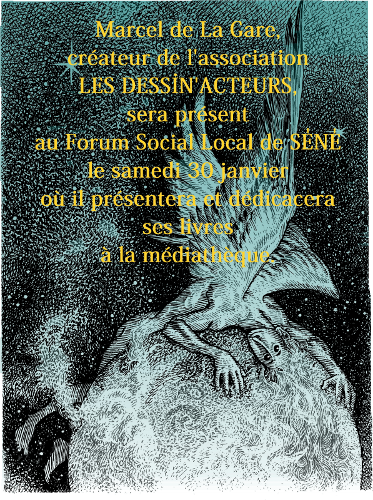 Marcel de La Gare échangera sur le stand des Dessin'Acteurs sur la démarche militante de cette association et dédicacera (son nouvel album) « Tout va de traviole ! ». Exposition des dessins du livre ainsi que du prochain « AHIMSÂ » (roman graphique BD sur la non-violence : http://fr.ulule.com/ahimsa-l-instantneige).