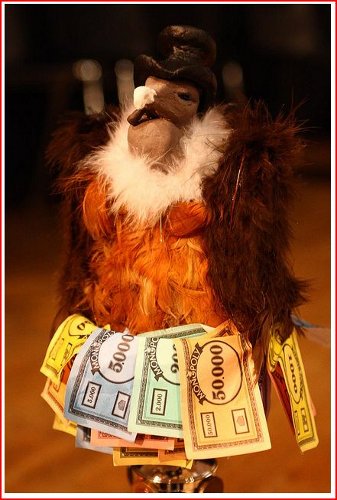 C'est Gérard Filoche qui a choisi la patronne des patrons. C'est donc lui qui monte sur le podium pour recevoir le trophée - un vautour à haut de forme et cigare dans le bec, cerné par des billets de Monopoly. L'inspecteur du travail la range dans sa valise à roulettes. « C'est de l'ironie, quand même, je lance au micro : on est poursuivis par Jean-Charles Naouri, un ancien directeur de cabinet PS, et voilà que c'est le représentant du PS, aujourd'hui, qui rafle le prix… » C'est un cadeau empoisonné, en même temps : le vainqueur vient de signer un engagement, il est condamné à aller remettre cette coupe, en mains propres, à sa rapace préférée…