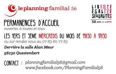 Le Planning Familial du Morbihan, en sommeil depuis les années 80, est relancé depuis 2017! L'association regroupe aujourd'hui une vingtaine de militant-es! Une permanence d'accueil se déroule les 1er et 3ème mercredi de chaque mois et sur rendez-vous, dans les locaux du planning familial à Questembert. Des interventions de sensibilisations ont également lieu, en milieux scolaires notamment. Thématiques abordées : la contraception, l'IVG, la prévention des IST/VIH, les relations affectives, relationnelles et sexuelles, les sexualités, la prévention des violences sexistes et sexuelles, la lutte contre toutes les discriminations et plus particulièrement celles liées au genre et à l'orientation sexuelle.